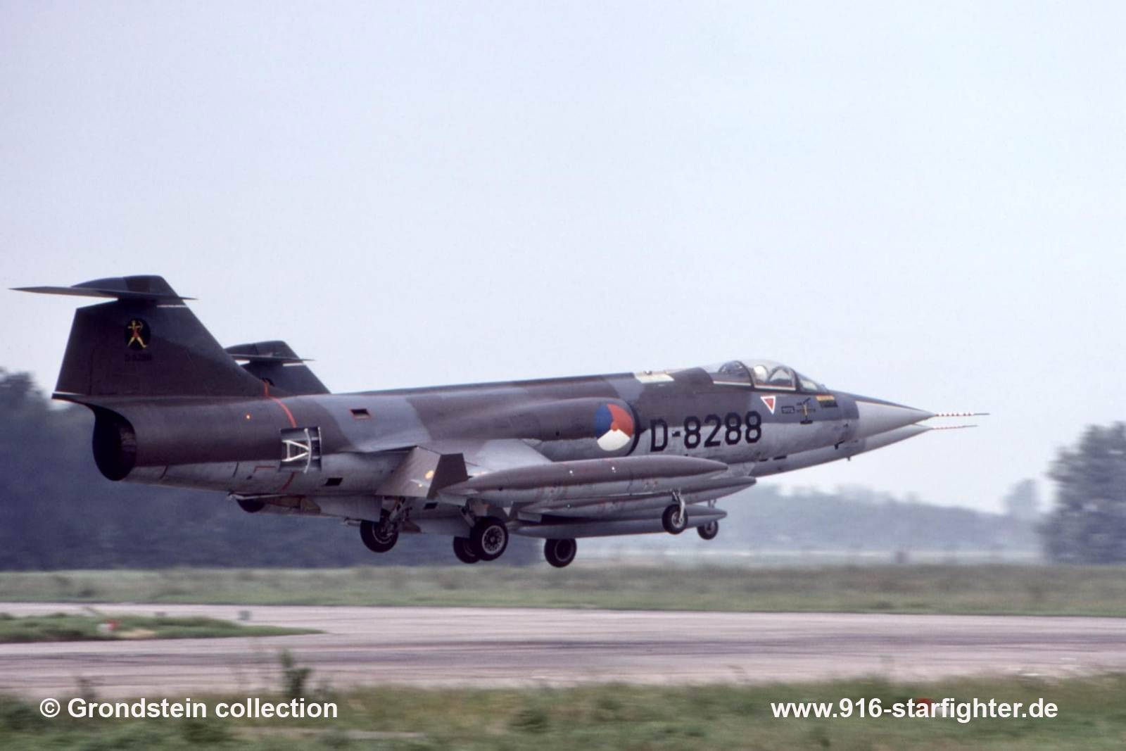 F-104G "D-8288" 323 squadron formation landing at Leeuwarden 31.July 1980 F-104G, construction number 683D-8288, model 683-10-19, built by FokkerFokker factory construction number 10738; taken on charge at Shiphol December 9, 1964 coded D-8288; 322/323 squadrons pool at Leeuwarden AB September 15, 1967 encountered a bird strike with engine damage, got a new engine and was repaired February 2, 1968 sustained severe damage to the pitottube due to a lightning strike. The pitot head was damaged beyond repair and whole system with pitot had to be replaced April 1, 1969 encountered a birdstrike while landing at Leeuwarden AB damaging its right-hand side wheel door which had to be replaced early June 1974 it sustained severe damage to the air intake and engine due to a birdstrike, aircraft had so much damage that it had to be taken to Fokker Avio Diepen arriving the 27th of June. The engine (nr 414-739) was replaced by engine 414-270 and the total repair took 1.382 manhours. It was given back to Leeuwarden AB again on 15th November 1974 withdrawn from use December 15, 1980