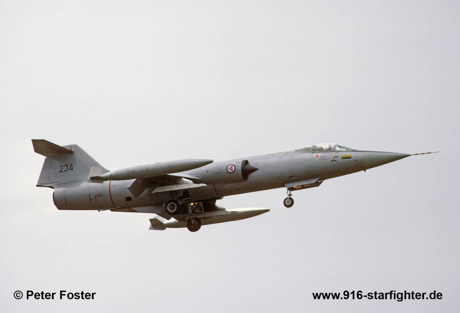 F-104G "234" 331 Skv RNoAF at RAF Honington May 1978 RF-104G construction number 683C-4036, model 683-04-10, US serial number 62-12234, built by LockheedMAP to Norway delivered via the escort carrier USS "Croatan" which arrived at Agag harbor on August 6, 1963 It also had a RF-104G camera housing like lots of the early Norwegian Starfighters did. They did not wear cameras and soon were removed during the first maintenance cycle (or IRAN) coded "FN-S" on August 7, 1963 to 331 squadron, modified to F-104G in August 1963, coded "234" from September 1, 1972 crashed coded "234" into sea near Helligvaer, 17 NM NE of Bode AB on September 10, 1980. Two fighters had been on a mission to identify and photograph unidentified planes west of the Lofoten On approach to Bodø AB one of the fighters crashed in the sea after a series of abnormal movements. The pilot managed to eject, but was too low for the chute to open. He was killed on the spot. Lockheed C-2 seat, written off; 3.245 flight hours. copyright © Peter Foster