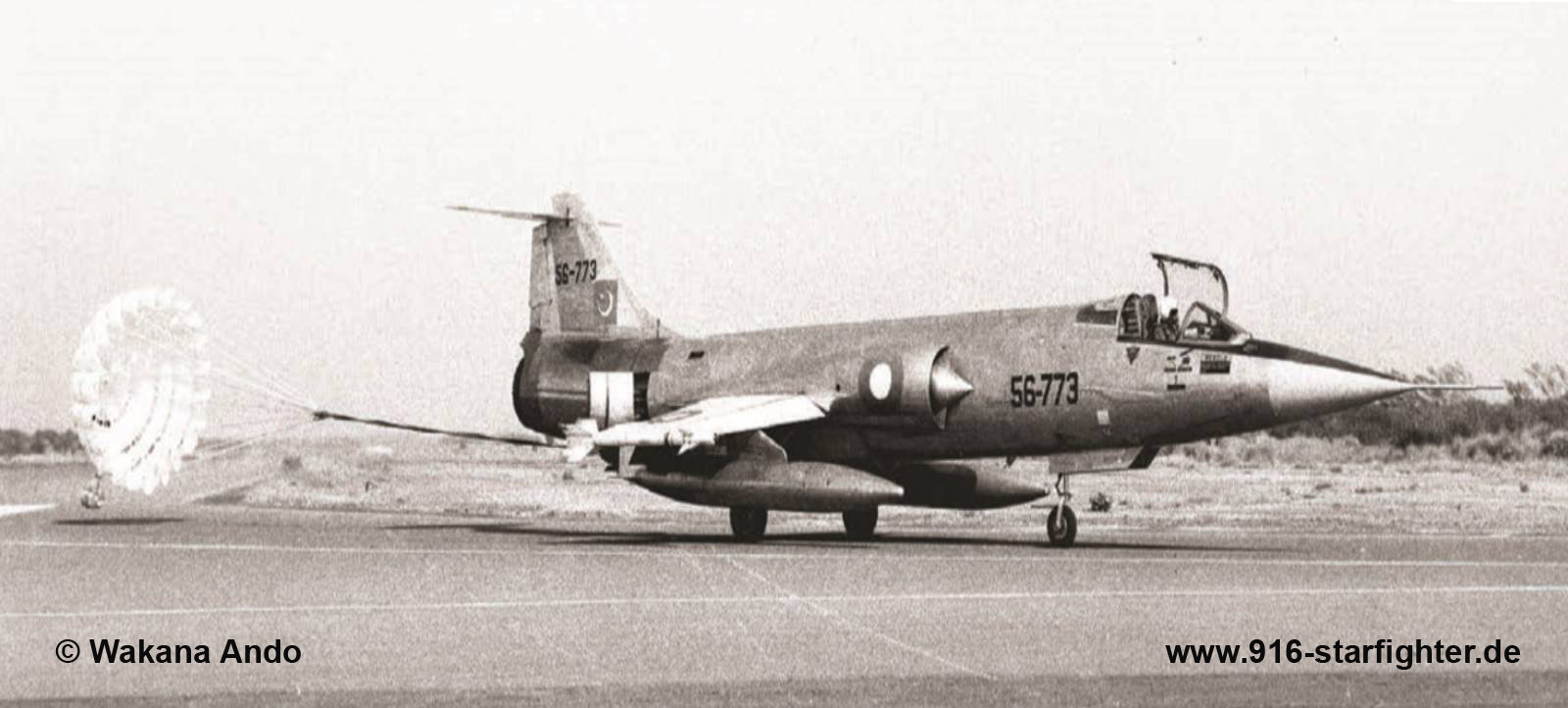 MAP to Pakistan May 1, 1964; in October 1064 at PAF Peshawar 9 squadron airshow shot down during war on December 13, 1971 as "56-773", WgCdr MH Middlecoat was shot down with GSh-23 cannon by Flt Lt B Soni in a MiG-21FL over Gulf of Kutch after attack on Jamnagar AB, pilot ejected but was not found (MIA). copyright © Wakana Ando