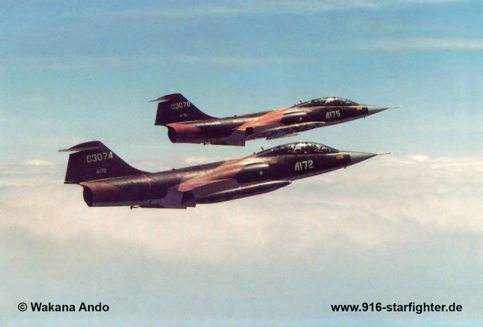 TF-104G "4175" of 2 Wing ROCAF in SEA camouflage scheme 1980s TF-104G, construction number 583D-5749, company model 583-10-20, US serial number 61-3078, built by Lockheed manufactured by Group USA (ARGE-USA); first flight 1963 coded with US serial number "61-3078"; delivered 1963 for Germanyoperated at Luke AFB by the 4510 CCTW (German shadow serial number 2747) in USAF Silver-finish colors coded 13078 2.871 flight hours in May 1977; flown until end of operation at Luke AFB on March 16, 1983; struck off charge order (AVA) July 21, 1983; sold 1983 to USAF with "Phase II" lot