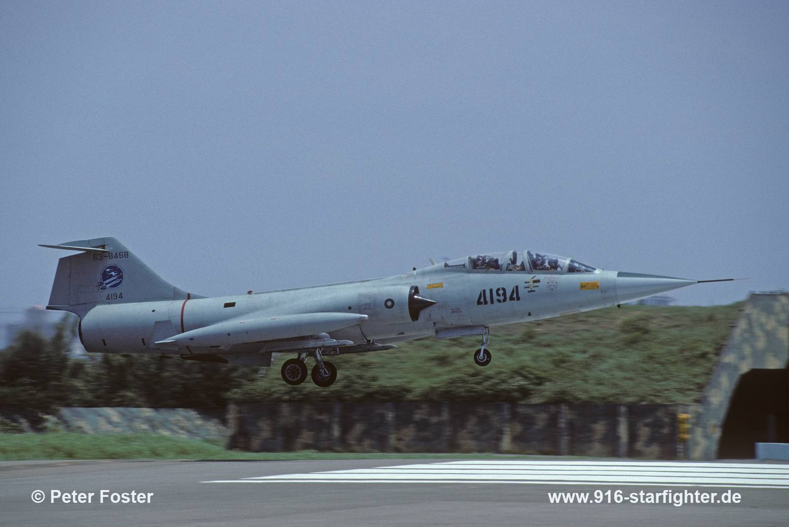 TF-104G "4194" ROCAF 12 SMS landing at Hsinshu AB in August 1996 TF-104G, construction number 583D-5777, company model 583-10-20, US serial number 63-8468, built by Lockheed manufactured by Group USA (ARGE-USA); assembly and test flights at Lockheed-Palmdale for Germany; first flight 1963 with US registration "63-8468"MAP (Military Assistance Program) delivered to Germany at Luke AFB in 1963 operated by the 4510th CCTW Luke AFB (German shadow serial number 2769) in USAF Silver-finish colors coded 38468 long term storage in May 1977 with 2.722 flight hours; struck off charge order (AVA) January 24, 1983; sold to USAF with 2.698 flight hours with "Phase I" lot