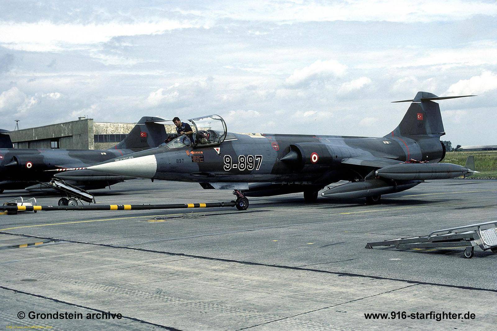 F-104S "9-897" 192 Filo of 9.AJU (Main Jet Base) Turkish Air Force at Lechfeld AB July 21, 1981 F-104S, construction number 783-1197, TuAF serial number 75-6897, model 783, built by Aeritaliadelivery date May 7, 1976; to 193 Filo at Balikesir AB; "897" to 192 Filo on July 1, 1976; "9-897" July 1981 at Lechfeld AB, Germany; to 191 Filo on June 1, 1984 withdrawn from use and stored May 1993 at Eskisehir AB; CFE cut-up July 3, 1995; scrapped. TuAF Sqn, Wing, Turkish Air Force F-104S Base 142 Filo 4.AJU Murted AB, first delivery December 18, 1974, official ceremony on March 14, 1975, F-104S transferred 1980 to 191 Filo of 9.AJU Balikesir AB 193 Filo 9.AJU Balikesir AB, first delivery January 21, 1975, merged into 192 Filo in July 1976 192 Filo 9.AJU Balikesir AB, July 1976 - 1983 191 Filo 9.AJU Balikesir AB, 1980 - 1993 copyright © Grondstein archive