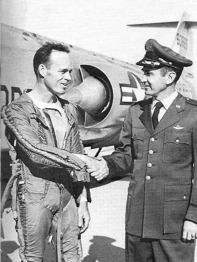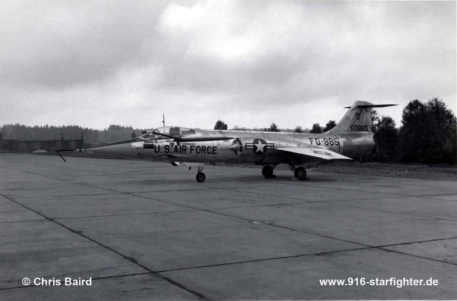 F-104C "FG-885" (56-0885) TAC, Edwards AFB 1958 F-104C, construction number 183-1173, model 183-93-02, US serial number 56-0885, built by Lockheeddelivered to the USAF on September 22, 1958, September 1958 to AF Flight Test Center (Air Research and Development Command), Edwards AFB, CA January 1959 to 479th Tactical Fighter Wing (Tactical Air Command), George AFB CA, March 1959 to AF Special Weapons Center (ARDC), Kirtland AFB, NM on December 14, 1959 Joseph "Joe" B. Jordan reached 103,395.5 feet, he achieved this record on his fifth and last flight of the record series. For the record flight, he started his zoom at an indicated of Mach 2.353 at 39,575 feet, pulled a maximum of 3.15 G and rotated to a maximum climb angle of 49.5 degrees. His afterburner blew out at 70,000 ft (indicated), he shut down the engine at 81,700 ft, and he coasted over the top at 54 KIAS June 1960 to Lockheed Aircraft, Burbank, CA; October 1960 to 479th Tactical Fighter Wing (TAC), George AFB (deployments to Moron AB Spain) crashed May 9, 1961 in Spain with 476 TFS after losing control of the aircraft due to flight control malfunction (Stabilator hydraulic servo pin fell out) pilot ejected safely, 52 NM ESE of Moron AB, Spain. copyright © Chris Baird