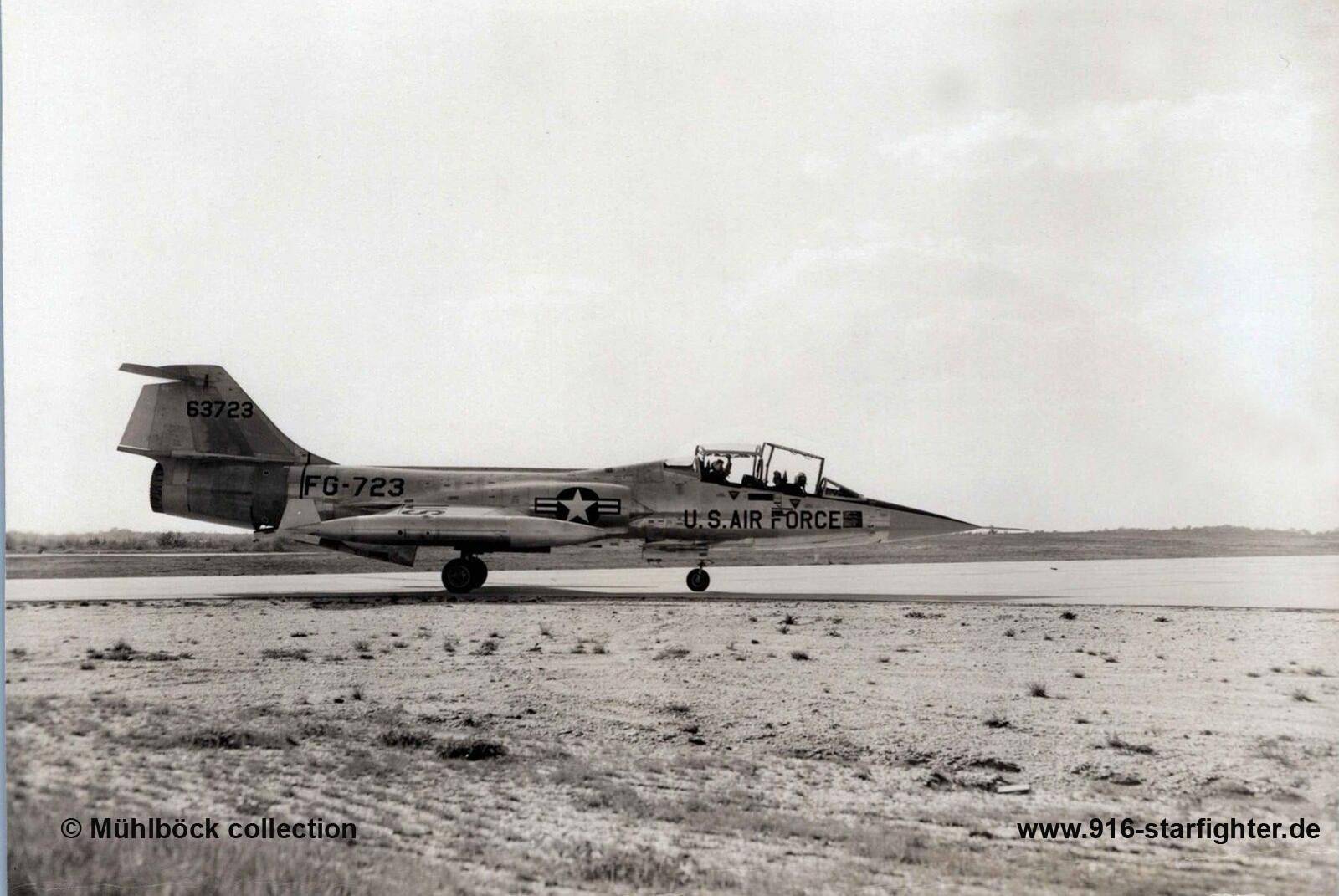 F-104B "FG-723" (56-3723) F-104B, construction number 283-5004, model 283-93-03, US serial number 56-3723, built by LockheedDecember 3, 1957 FG-723 available; January 29, 1958 USAF accepted; delivery date February 3, 1958 February 1958 to AF Proving Ground Center (Air Research and Development Command), Eglin AFB, FL (modified to JF-104B) 56th FIS (October 1958-February 1960); 157th FIS (February 1960-December 1962), major accident on December 10, 1962 when the Main Landing Gear retract cylinder failed due to fatigue AFLC (1963-May 1963); 319th FIS (May 1963-January 1967); 331st Fighter-Interceptor Squadron (Air Defense Command), Webb AFB, Texas (January 1967-February 1967) 4760th CCTS (February 1967-July 1967); 319th FIS (July 1967-October 1967); 4760th CCTS (Air Defense Command), Webb AFB, Texas (October 1967-December 1967) 319th Fighter-Interceptor Squadron (Air Defense Command), Homestead AFB, Florida (December 1967-December 1969); AFFTC (December 1969-1970) April 1970 to Sacramento Air Logistics Area, McClellan AFB, California