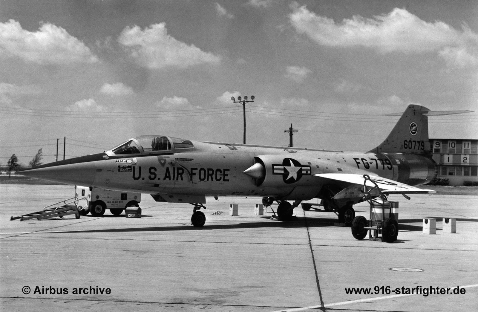 F-104A "FG-779" (56-0779) 331 FIS Webb AFB 1965 F-104B, construction number 183-1067, US serial number 56-0779, model 183-93-02, built by Lockheeddelivery date January 28, 1958; 83rd FIS (January 1958-July 1960); 197th FIS (July 1960-1962) Arizona ANG; 197th FIS at Ramstein AB 1962 157th FIS (September 1962-June 1963); 331st FIS (June 1963-September 1965), 319th FIS (September 1965-October 1965); accident October 12, 1965; store (1966-March 1968) MASDC (08Mar68-08Mar72) as RIT coded "FB018", scrapped Allied Aircraft 1985 (?) 56-0779 serial unconfirmed stored March 2016 at Chino Yanks Air Museum, 36 miles East of Los Angeles; September 2018 noted. Previously reported as 56-0785, but this was written off when damaged by fire during an engine start, which certainly isn't evident on this airframe. It is now believed to be 56-0779, which left storage at AMARC in 1980 and was reported as scrapped by Allied Aircraft in 1985. copyright © Airbus archive