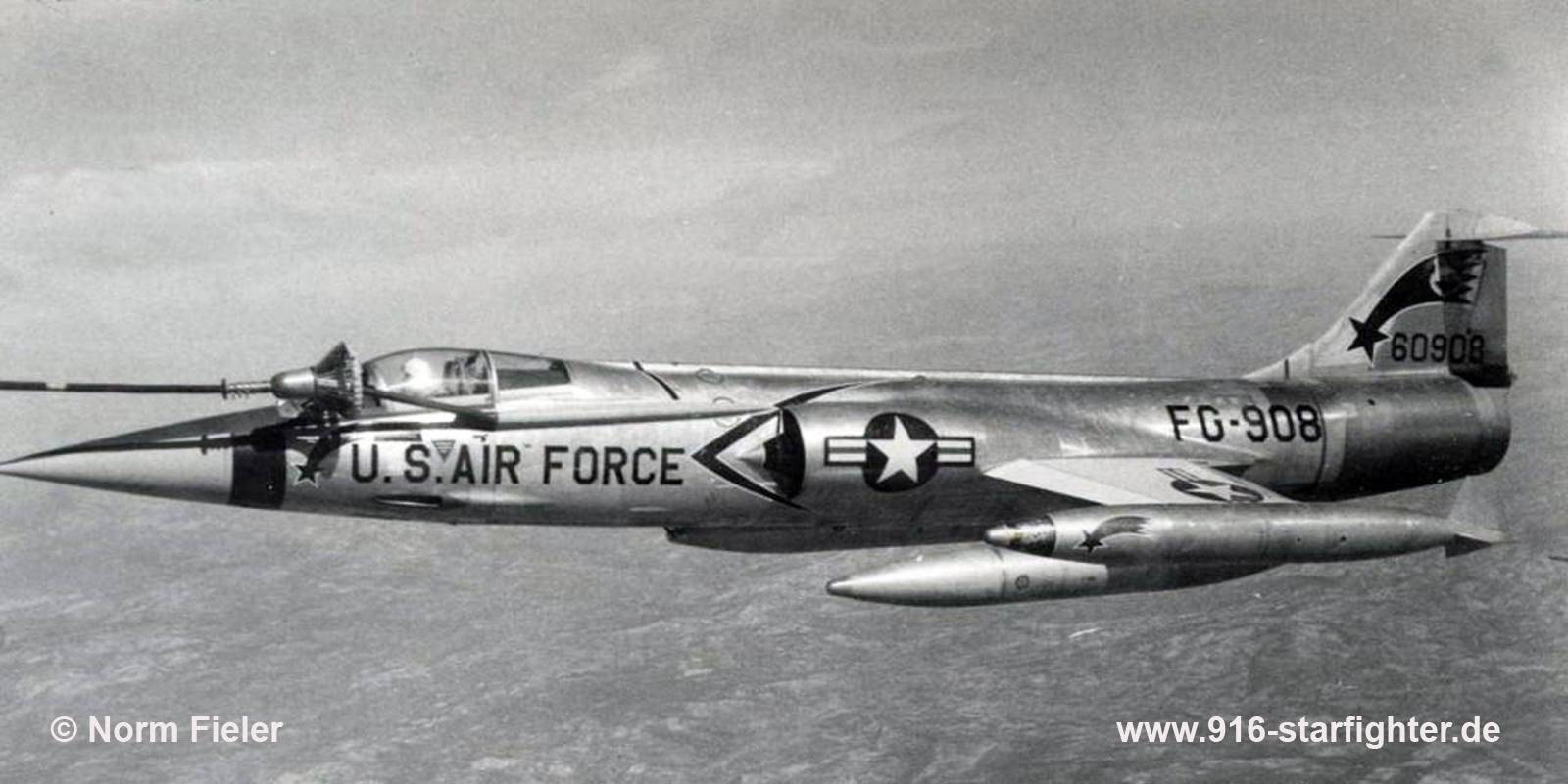 F-104C "FG-908" 476 TFS George AFB over Spain during TDY at Moron AB 1959 F-104C, construction number 183-1196, model 483-04-05, US serial number 56-0908, built by Lockheeddelivery date December 18, 1958; 479th TFW, 476th TFS Moron AB, Spain 1960 hit by ground fire on a bomb run with 2 "M-117" 750 lbs bombs on July 22, 1965 with 436th TFS (attached to 6252nd TFW) crashed after a gear up emergency landing at Chu Lai MCAS, Vietnam, battle-damaged aircraft (after a CAS mission) swerved off the runway into a sand dune after gear up landing, pilot was killed (KIA), operated out of DaNang AB, Vietnam, attached to 6252nd TFW, written off. copyright @ Norm Fieler