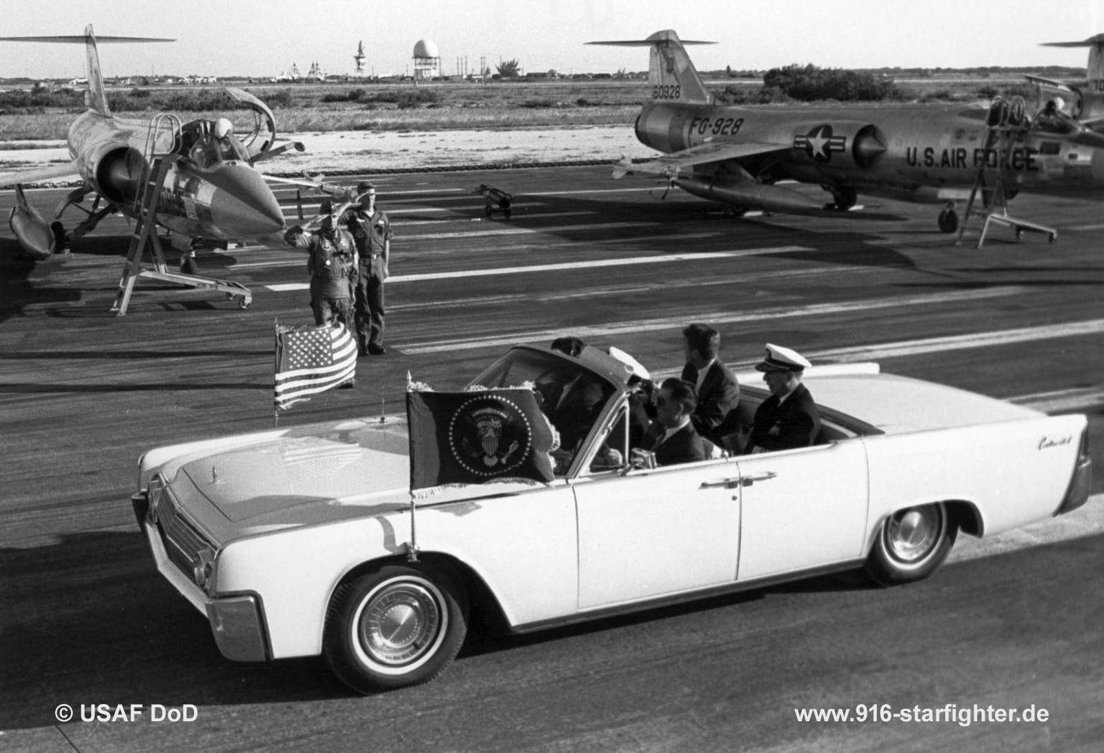 F-104C at Boca Chica NAS during inspection by President Kennedy and the Joint Chiefs on November 26, 1962 at the trip to Key West, Florida The huge plane came in from the Northeast, a Boeing 707 bearing the words "United States of America" and the presidential seal. Aboard Air Force One were President John F. Kennedy, his long-time secretary Evelyn Lincoln, Florida Governor Farris Bryant, two Florida congressmen and the commanding officers of the Army, Air Force, Navy and Marines (the joint chiefs of staff). The Cuban missile crisis had ended one month earlier, and the President and the military brass were visiting the Keys to inspect the military installations hurriedly installed at the Boca Chica NAS and in Key West in response to the crisis. The President also came to thank personally the soldiers in the Keys who had served through a crisis in which the world teetered on the brink of a nuclear exchange. Two superpowers, the U.S.A. and the U.S.S.R., had faced off over the placement of Russian missiles in Cuba. Historians cite Kennedy's negotiation of a peaceful resolution to the missile crisis as his greatest accomplishment. But several of the Joint Chiefs traveling on Air Force One with Kennedy to Key West that day had strenuously argued for a military invasion of Cuba. copyright © USAF DoD