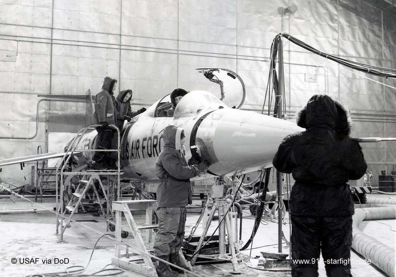 JF-104A (YF-104A) 55-2963 at Elmendorf AFB, Alaska during "Cold Weather Test" in 1958 YF-104A, construction number 183-1009, model 183-93-02, US serial number 55-2963, built by Lockheed ready for delivery June 29, 1956, acceptance by USAF June 29, 1956, delivery date September 18, 1956 January 1957 to Wright Air Development Center (Air Research and Development Command), Wright-Patterson AFB, OH (modified to JF-104A, deployments to Lockheed Aircraft, Burbank, and Edwards AFB, CA) cold weather tests at Elmendorf AFB, Alaska with Arctic markings, this intensive testprogram was named "Phase V" September 1961 converted to JQF-104A "QFG-963" with 3205 DS at Eglin AFB, FL shot down on February 1, 1962 by Bomarc G/A missile on 1st drone flight, painted orange overall. badge of Air Research and Development Command copyright © USAF via DoD